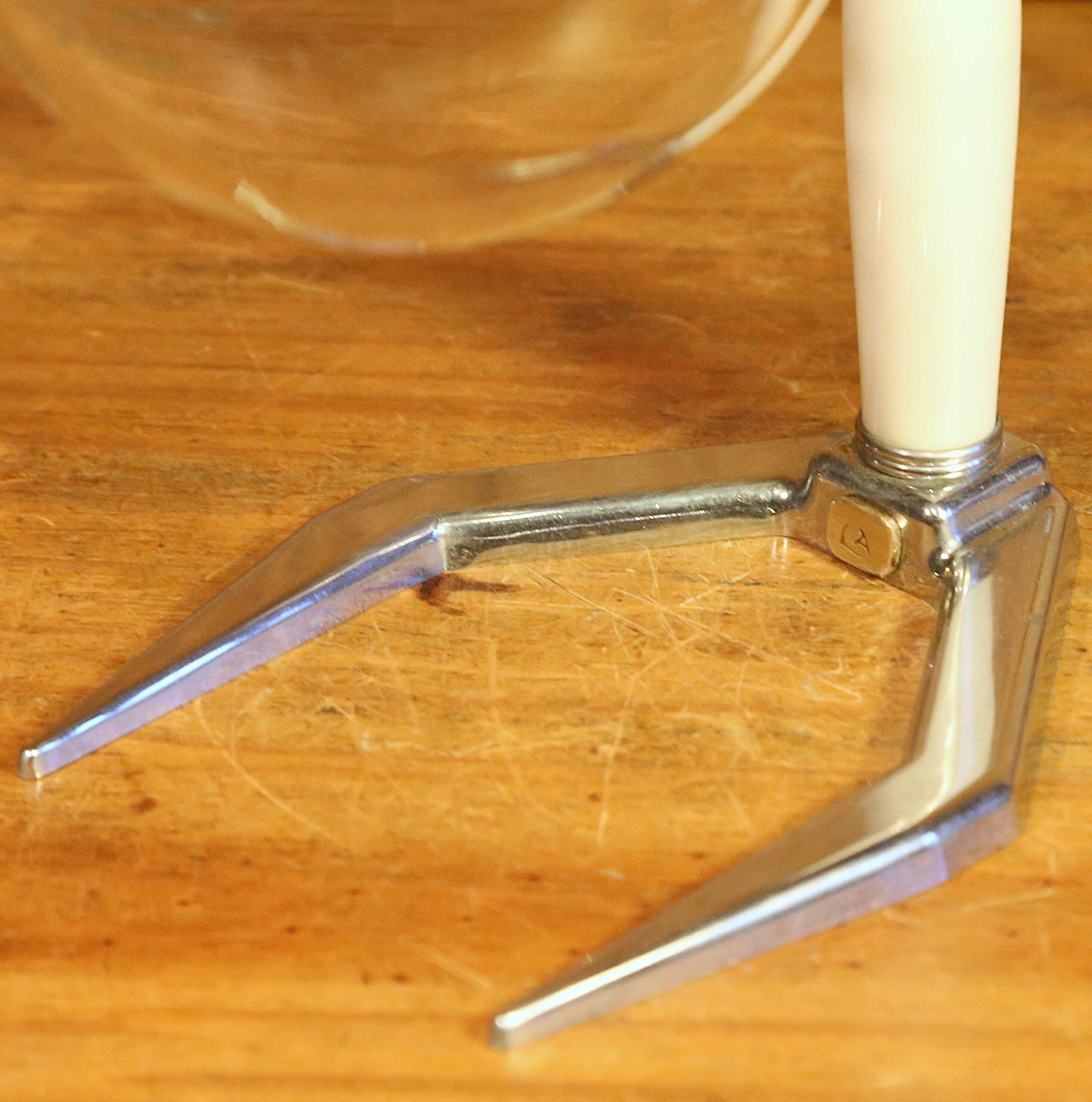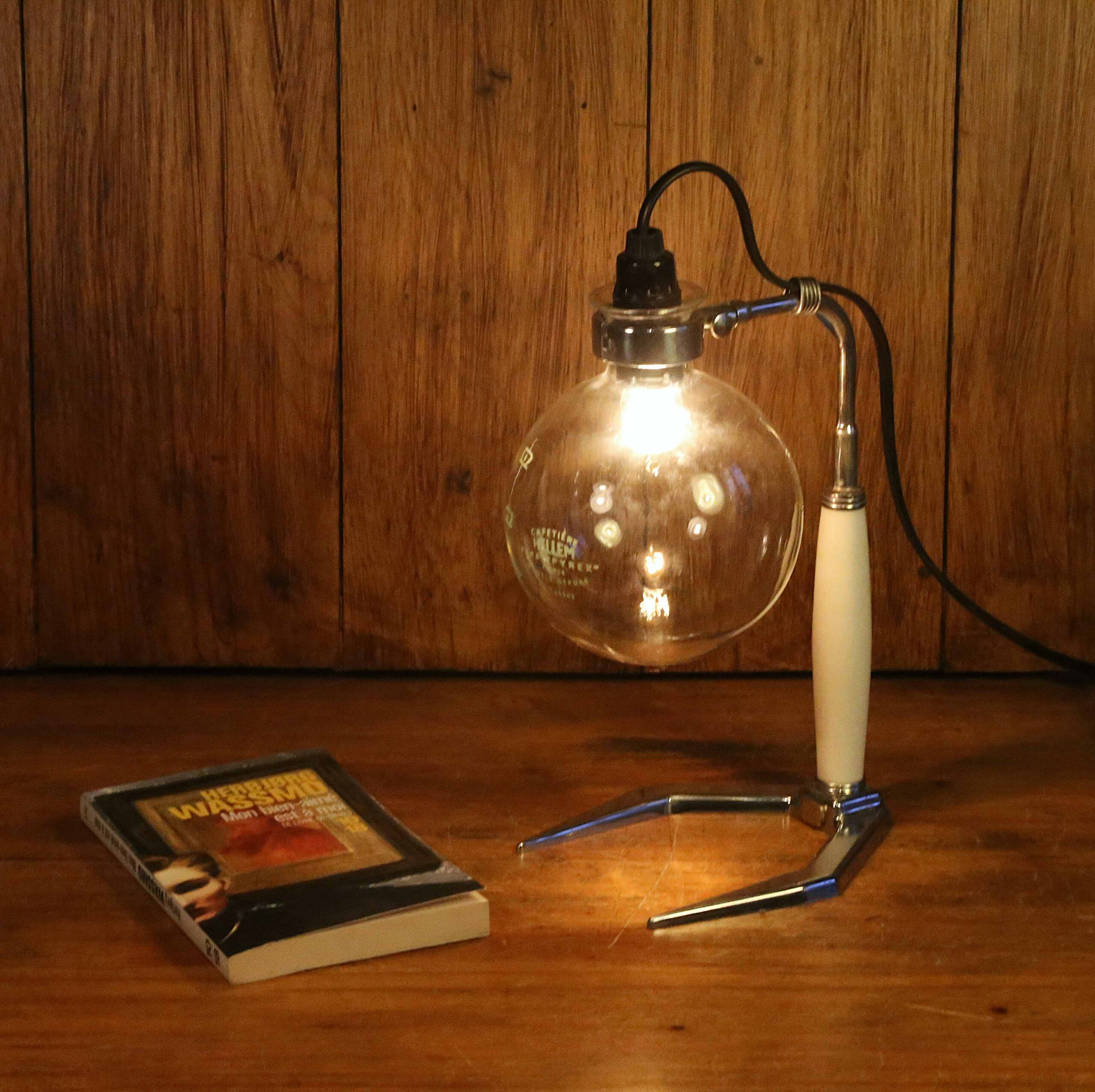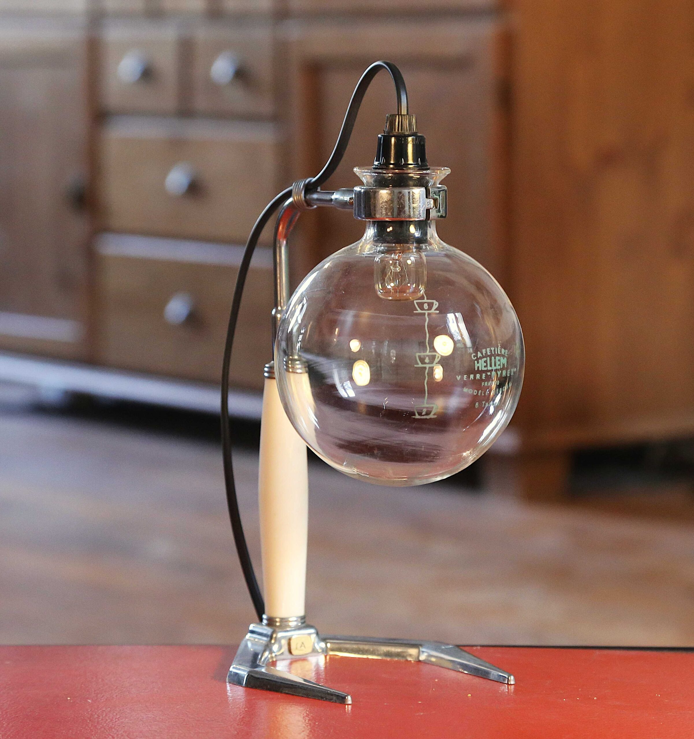 Lampe style Art Déco réalisée à partir d’une cafetière vintage des années 50. Un petit air d’ustensile de laboratoire de chimie pour cette ancienne cafetière à dépression de la marque Hellem à qui j’ai offert cette seconde vie en lampe. Elle ne fera plus le café mais éclairera d’une douce et chaleureuse lumière votre intérieur. La poignée est en porcelaine, la boule en verre est gravé du nom de la marque, la partie supérieure et le pied sont en métal argenté.