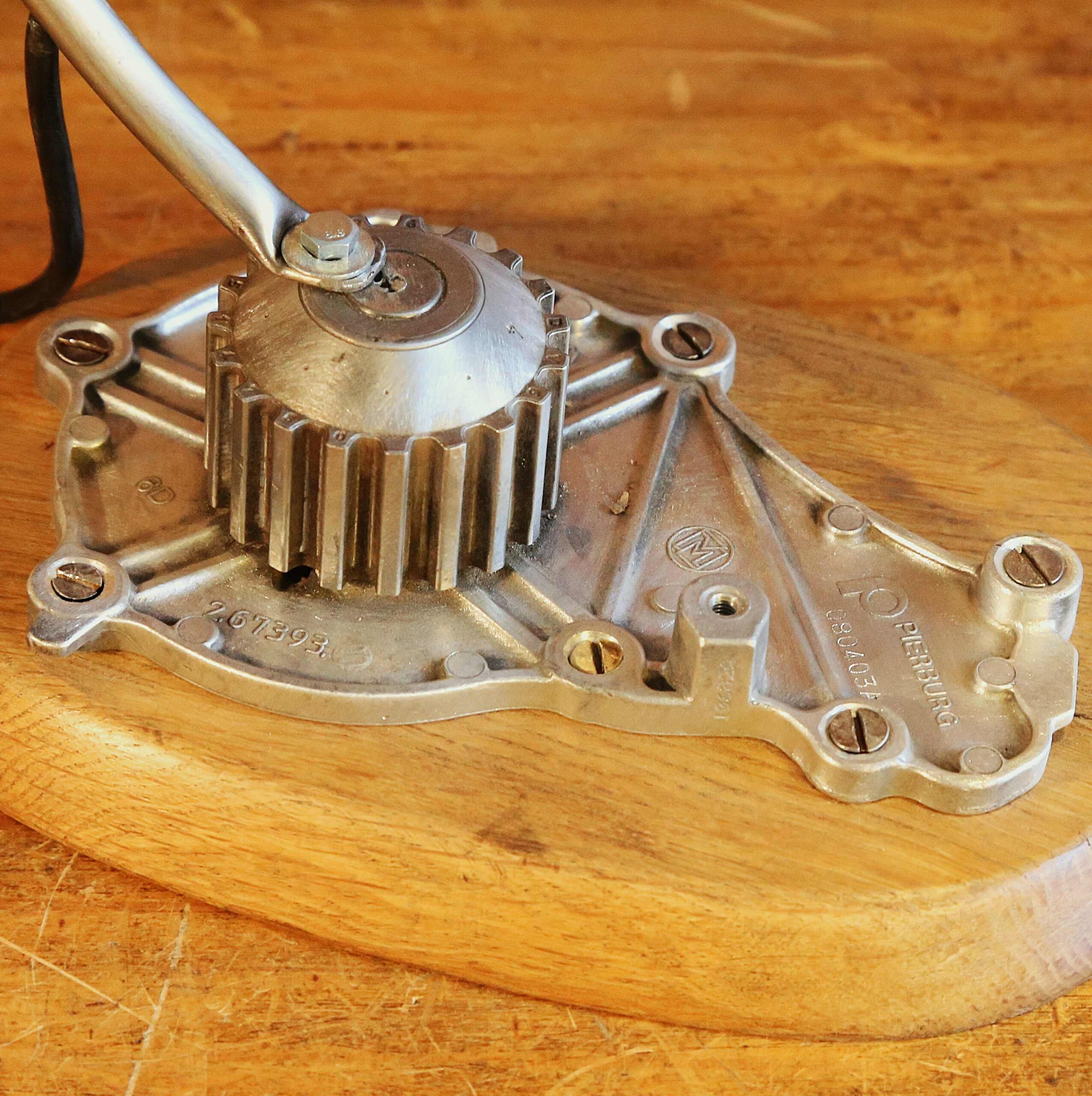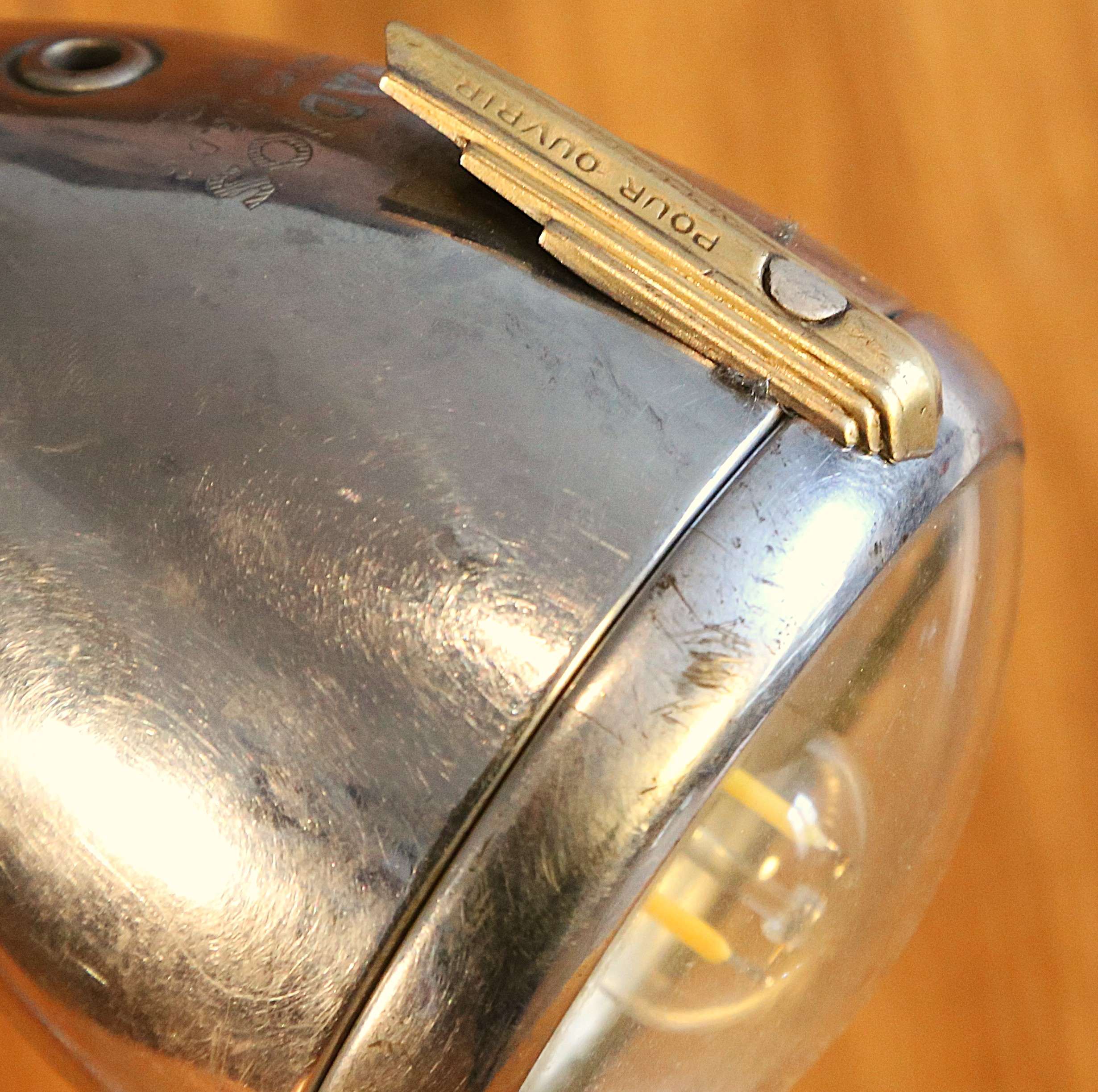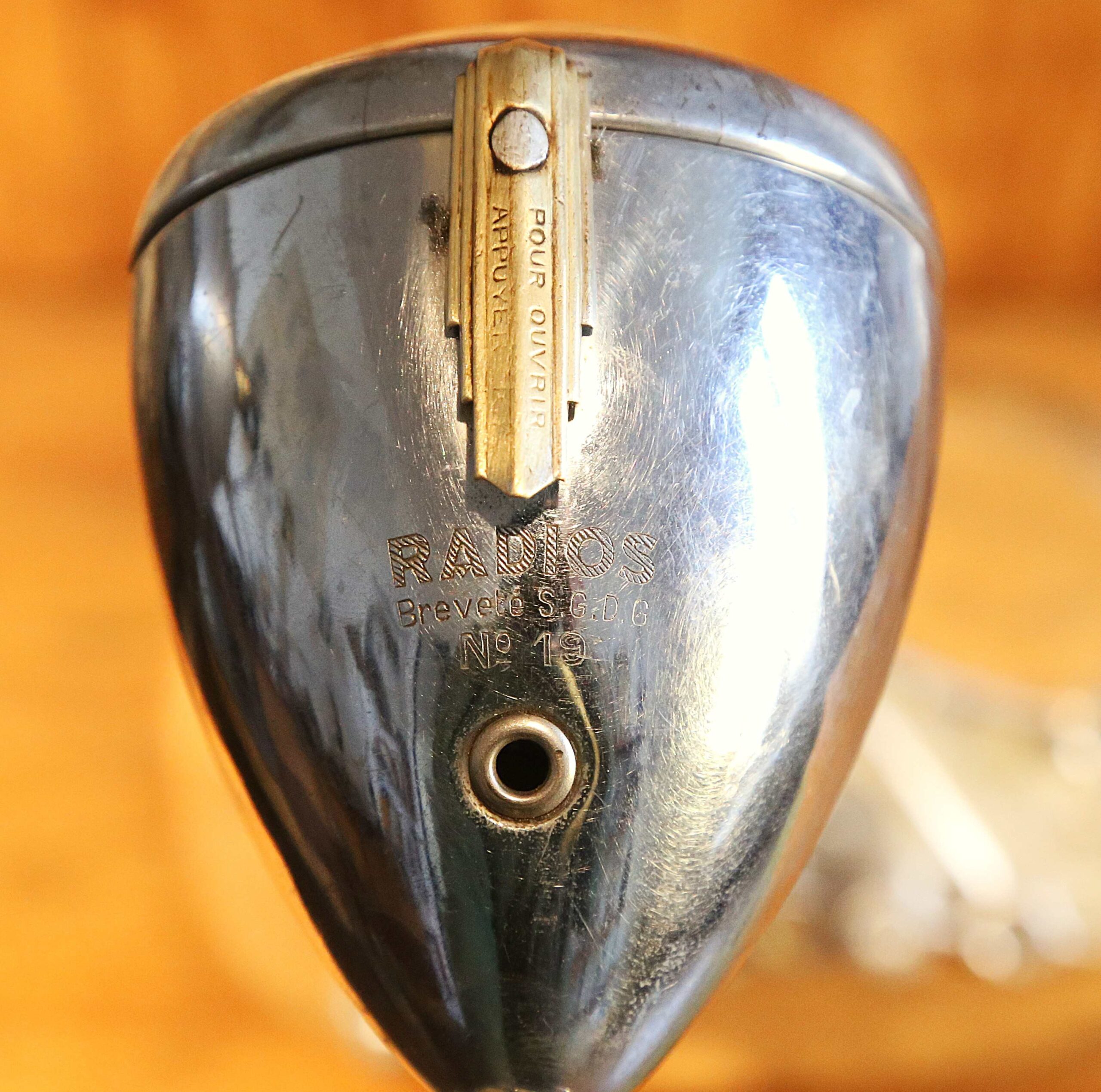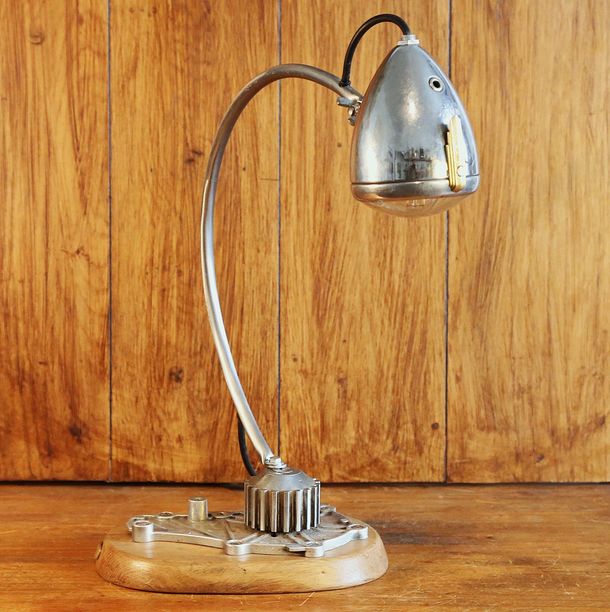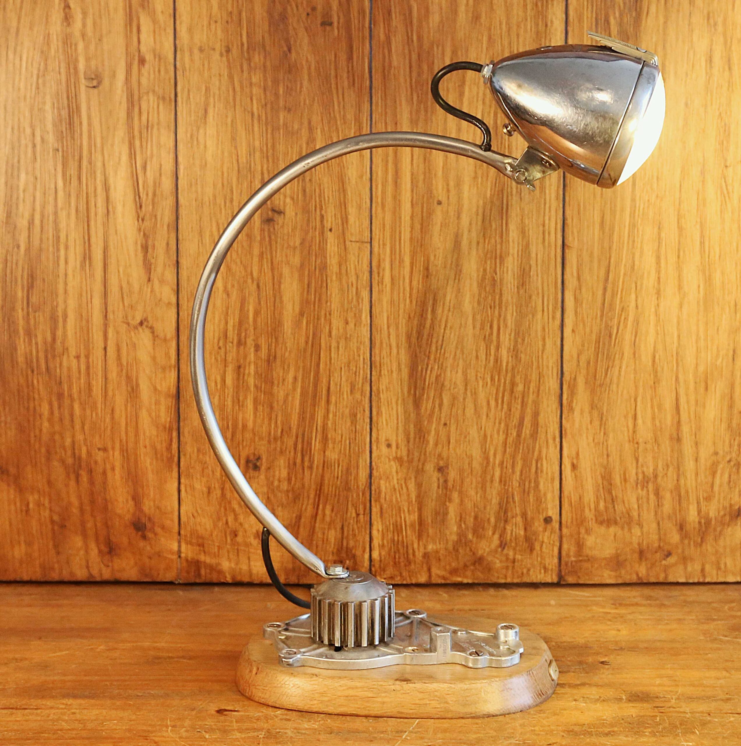 Des lignes épurées et fluides pour cette lampe de créateur réalisée avec un phare de vélo vintage. Entièrement en acier chromé, ce phare, de forme obis, date des années 20. Fabriqué par la marque Radios, modèle numéro 19 Brevet S.G.D.G (Sans Garantie Du Gouvernement), il est surmonté de son petit bouton d’ouverture, en laiton, aux formes typiques de l’Art Déco. Il est articulé, ce qui permet donc de l’orienter en inclinaison pour diriger la source de lumière à votre guise. La base est constituée d’une pompe à eau de moteur de voiture fixée sur un socle en vieux chêne massif patiné par le temps. Le bras courbé de la lampe est fixé sur la partie en mouvement de la pompe à eau, ce qui permet de faire tourner la lampe sur 360 degrés. .Le fil d’alimentation de l’ampoule est intégré dans le bras cintré. Une lampe originale et unique qui trouvera sa place sur un bureau, un chevet, un bout de canapé ou une table de nuit.