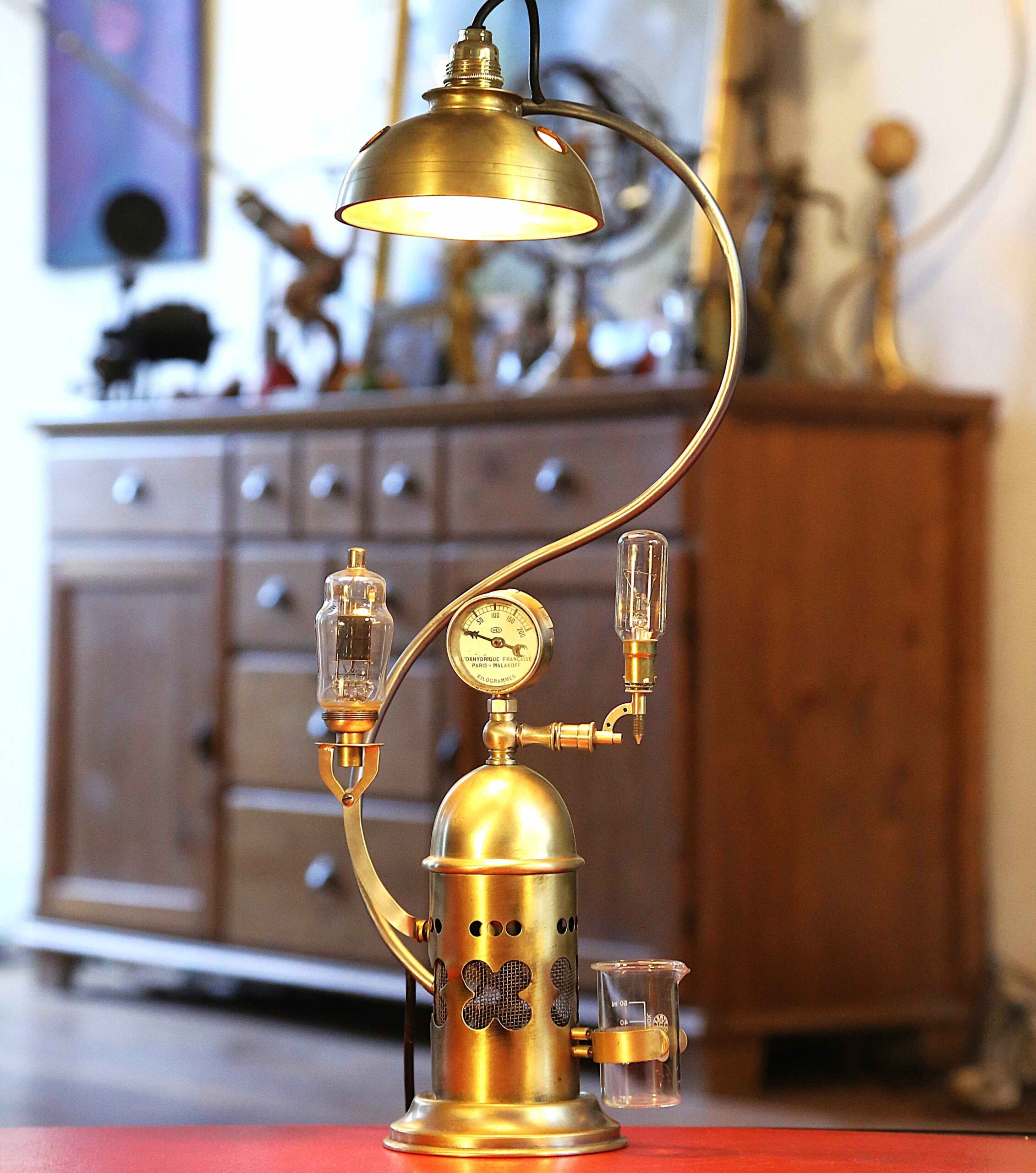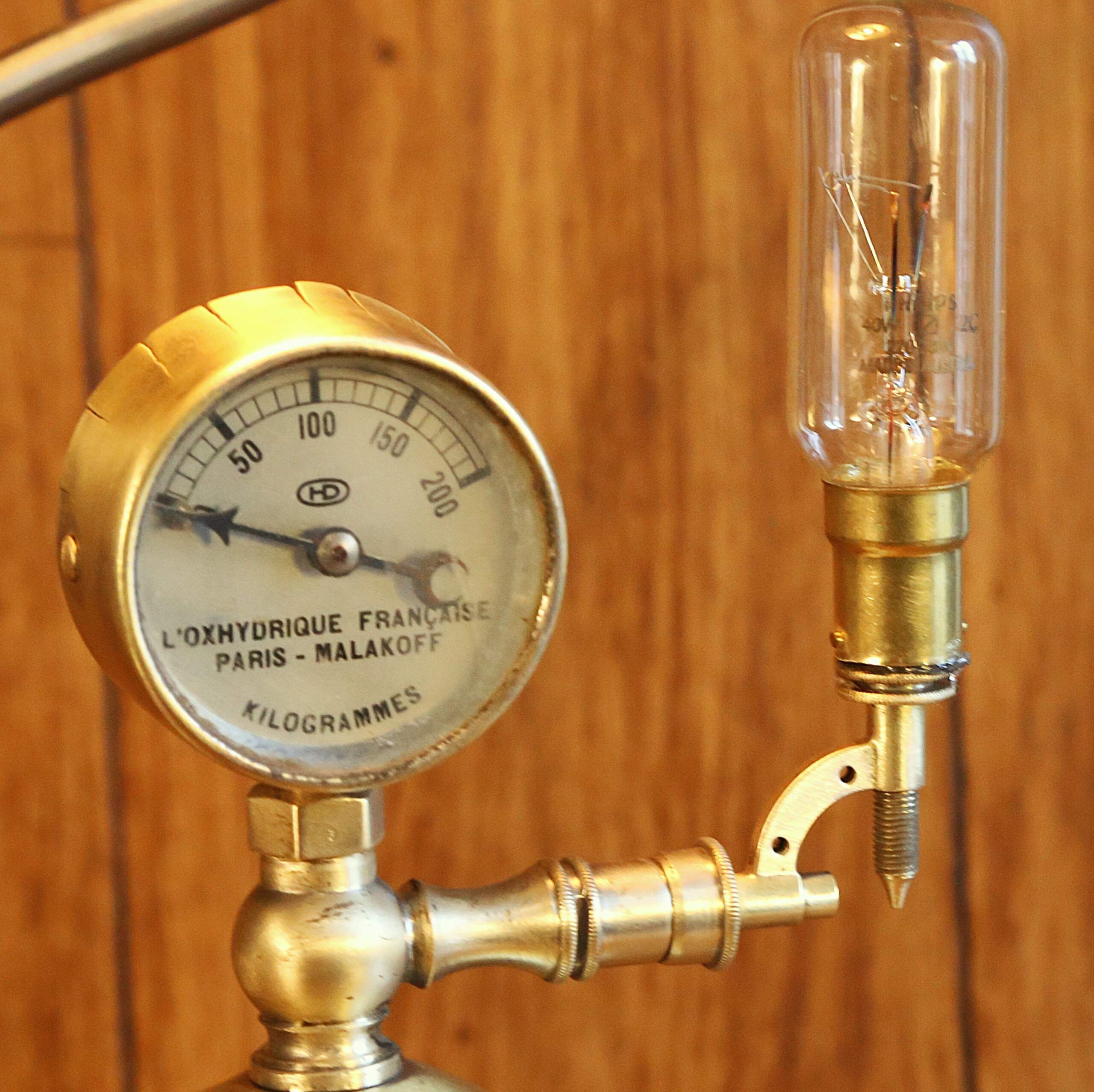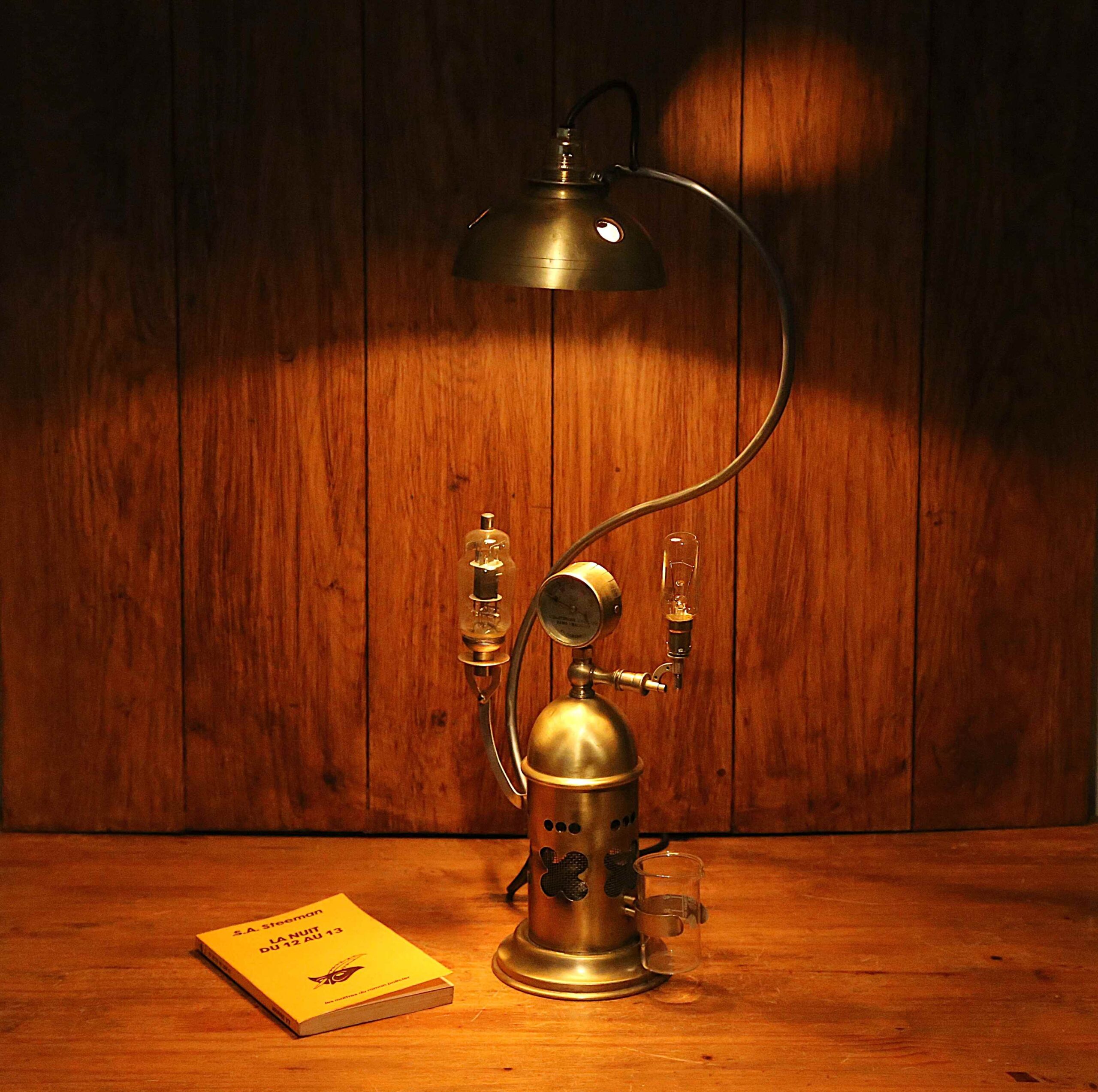 Lampe artisanale créée à partir d’un ancien instrument médical, un magnifique et rare petit vaporisateur en laiton mis au point par Lucas Championniere, chirurgien Français de la fin du XIX ième siècle. Cet instrument de médecine, qui fonctionnait à la vapeur produite grâce à un petit réservoir à alcool et une mèche en coton, permettait de pulvériser des produits antiseptiques sur les patients. Un très ancien manomètre de pression en laiton, une lampe tube (ancêtre des transistor et des circuits intégrés qui transforme un courant électrique) de radio TSF, un flacon de pharmacie en verre et divers autres objets ont été rajouté pour en faire un instrument encore un peu plus étrange, dans un style Steampunk et cabinet de curiosités. L’abat-jour, tout en jolies rondeurs et en laiton , provient d’une lampe lampe dite Parisienne. Il est réglable en inclinaison et dans toutes les directions.