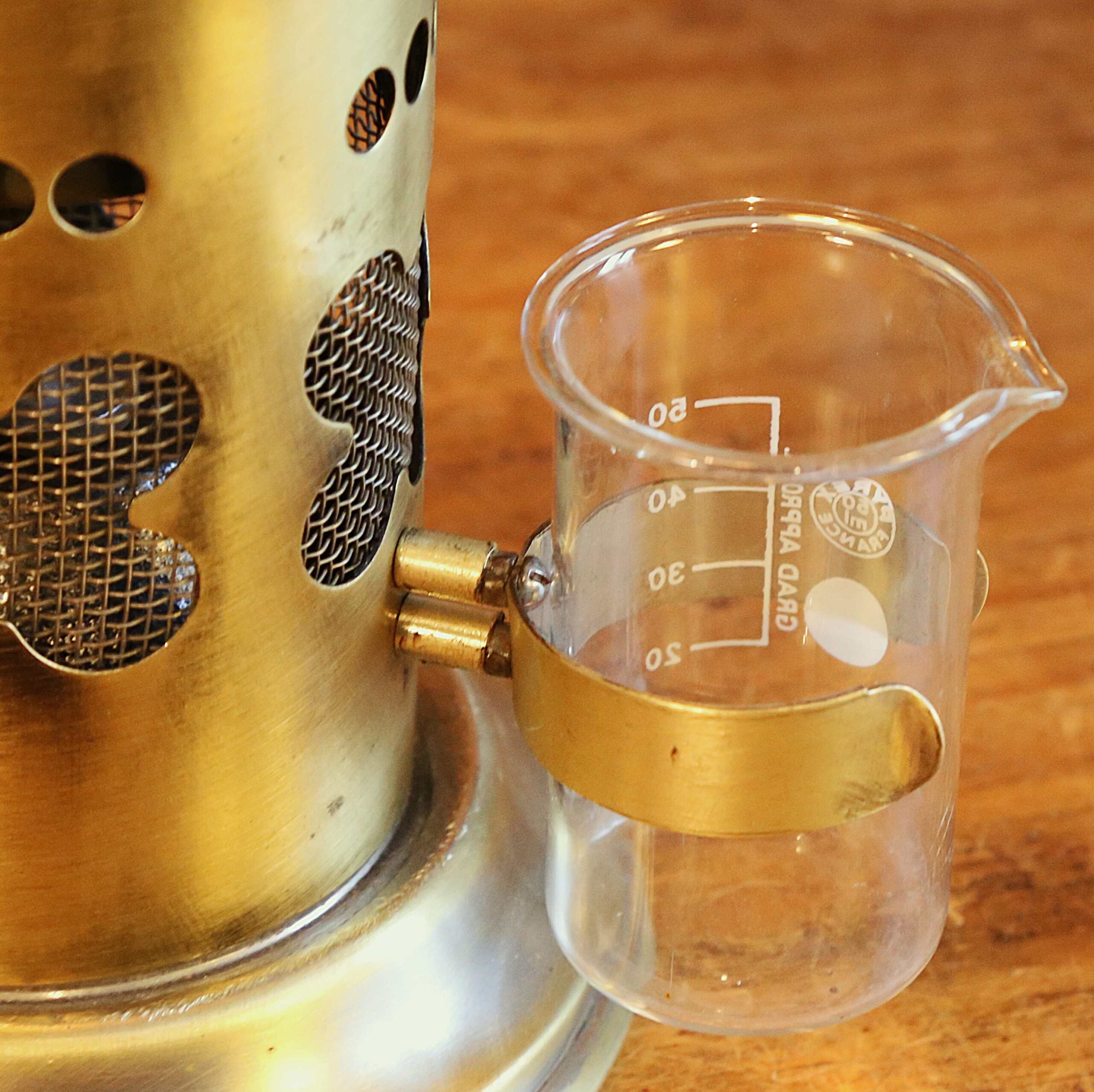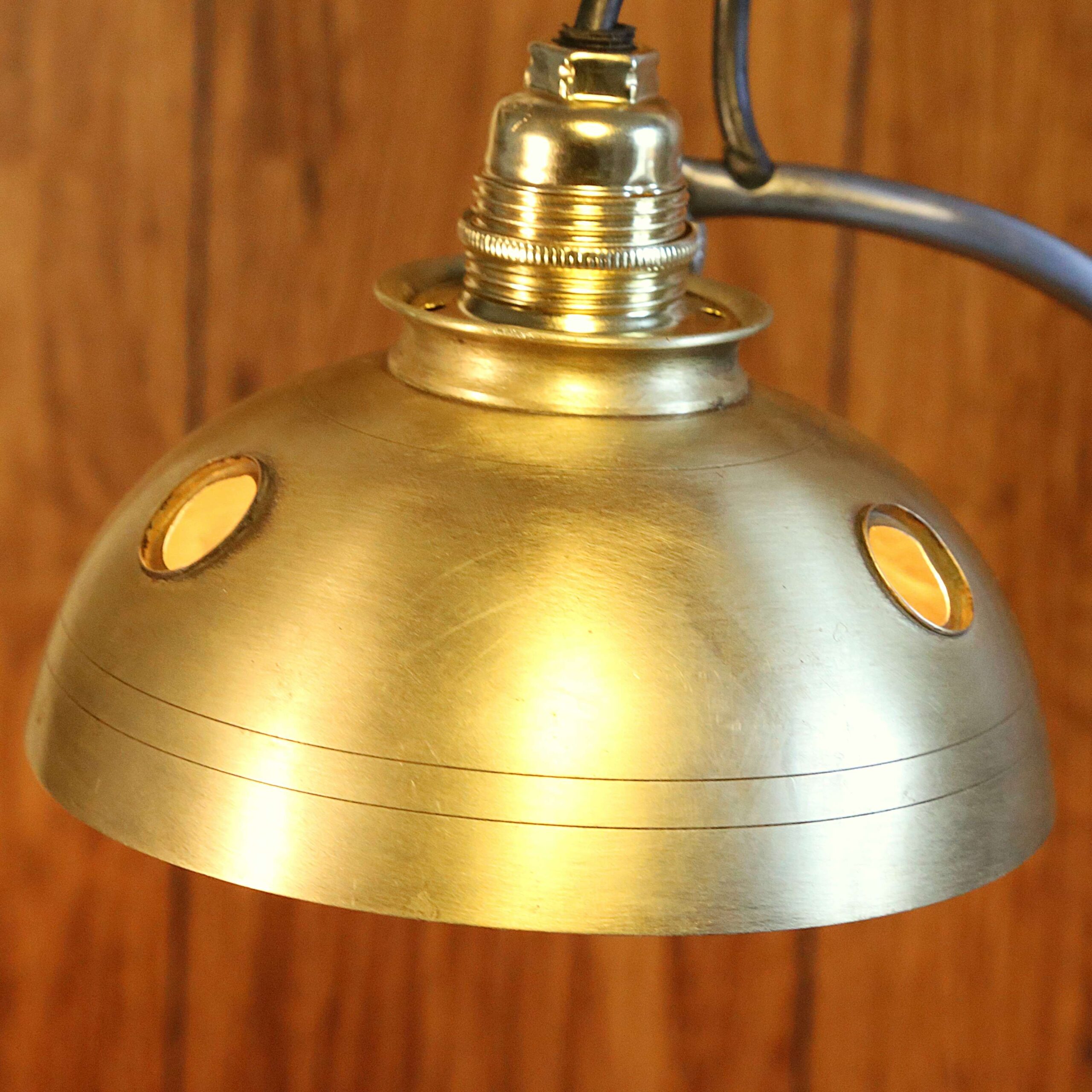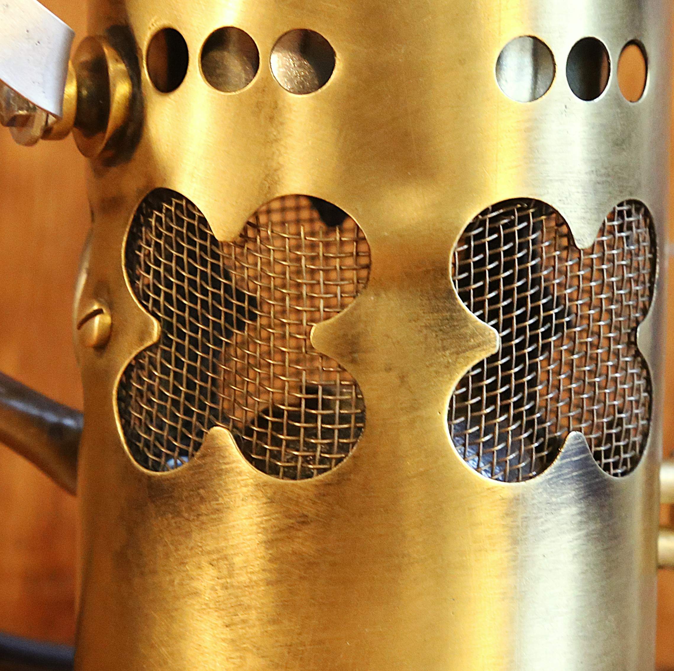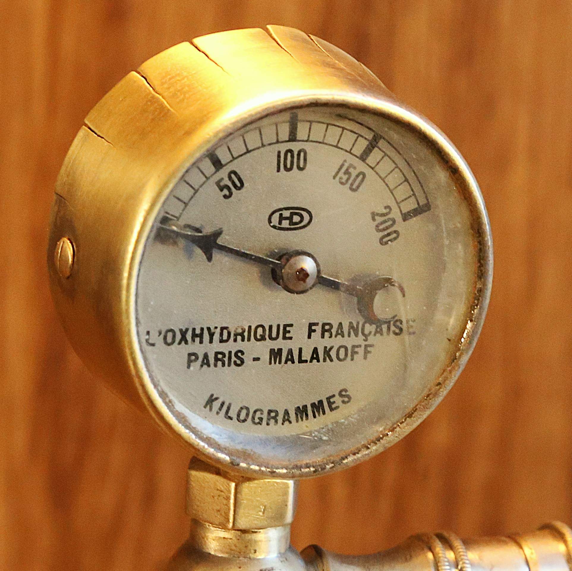 Lampe artisanale créée à partir d’un ancien instrument médical, un magnifique et rare petit vaporisateur en laiton mis au point par Lucas Championniere, chirurgien Français de la fin du XIX ième siècle. Cet instrument de médecine, qui fonctionnait à la vapeur produite grâce à un petit réservoir à alcool et une mèche en coton, permettait de pulvériser des produits antiseptiques sur les patients. Un très ancien manomètre de pression en laiton, une lampe tube (ancêtre des transistor et des circuits intégrés qui transforme un courant électrique) de radio TSF, un flacon de pharmacie en verre et divers autres objets ont été rajouté pour en faire un instrument encore un peu plus étrange, dans un style Steampunk et cabinet de curiosités. L’abat-jour, tout en jolies rondeurs et en laiton , provient d’une lampe lampe dite Parisienne. Il est réglable en inclinaison et dans toutes les directions.