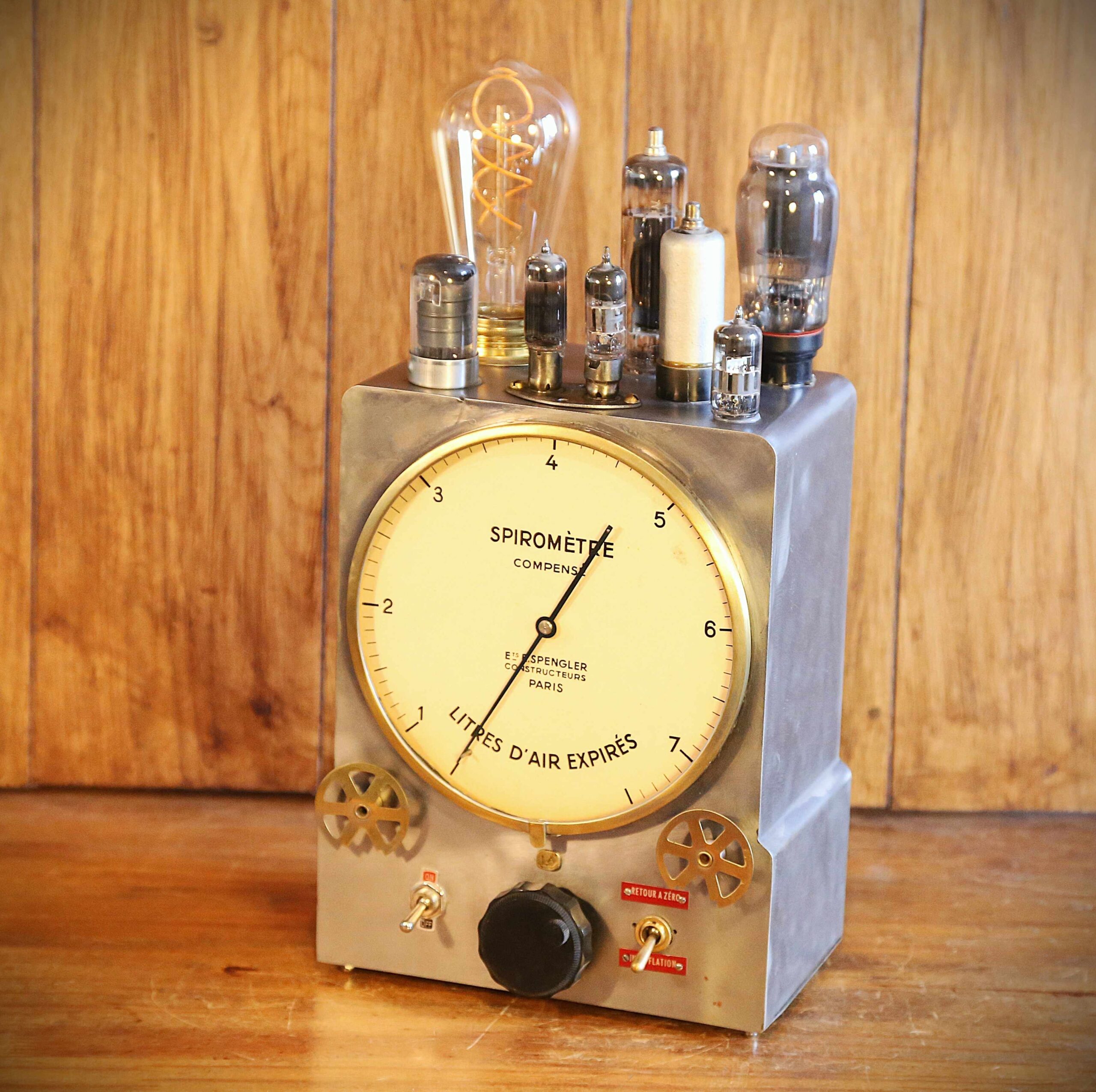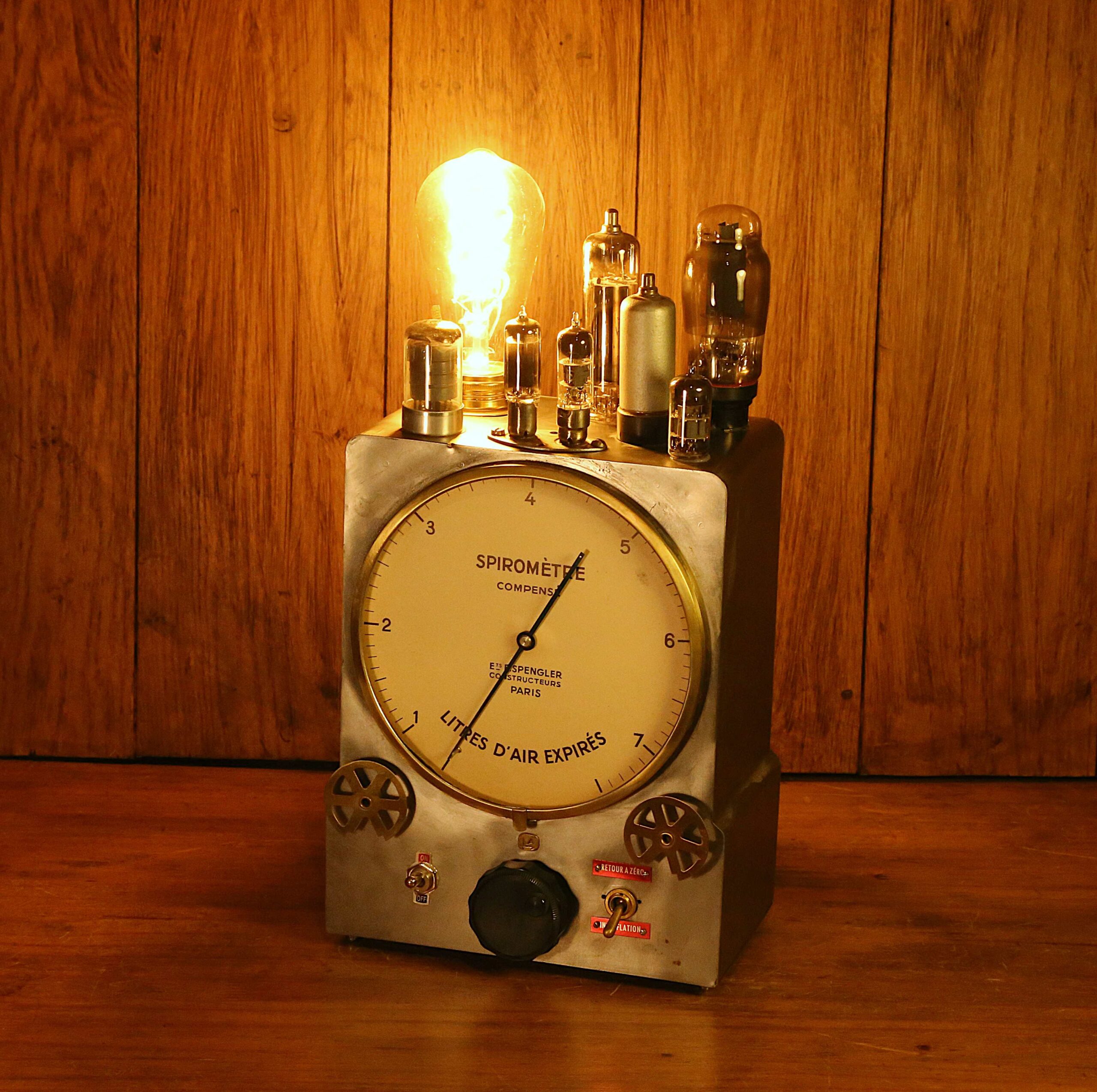 Création d’une lampe de métier à partir d’un instrument de mesure utilisé en médecine. Vous ne savez peut être pas le nom de cet instrument, qui est un Spiromètre, mais vous le connaissez surement puisqu’il sert à mesurer le volume d’air inspiré et expiré par un patient. Celui ci est un modèle ancien ,des établissements Splenger, Paris. Toute la peinture qui le recouvrait a été soigneusement brossée pour faire apparaitre la jolie patine de l’acier. Pour coller à l’esprit un peu Steampunk de cet instrument, des lampes tubes de radio TSF et des pièces en laiton ont été greffées dessus. Sur la façade, un interrupteur à levier On/Off style vintage permet d’allumer et éteindre la belle ampoule LED Edison qui émet une lumière d’ambiance chaude et chaleureuse.