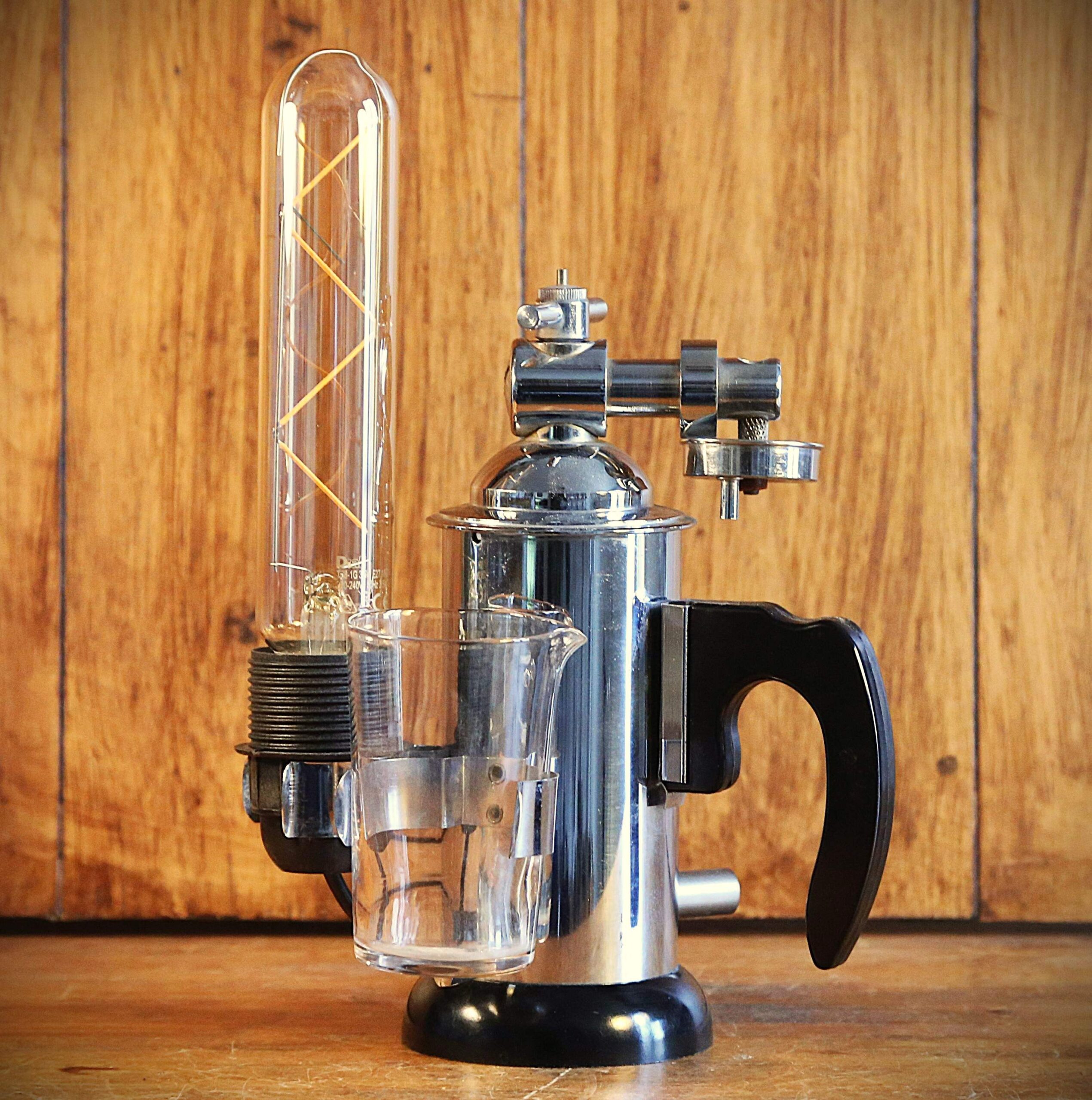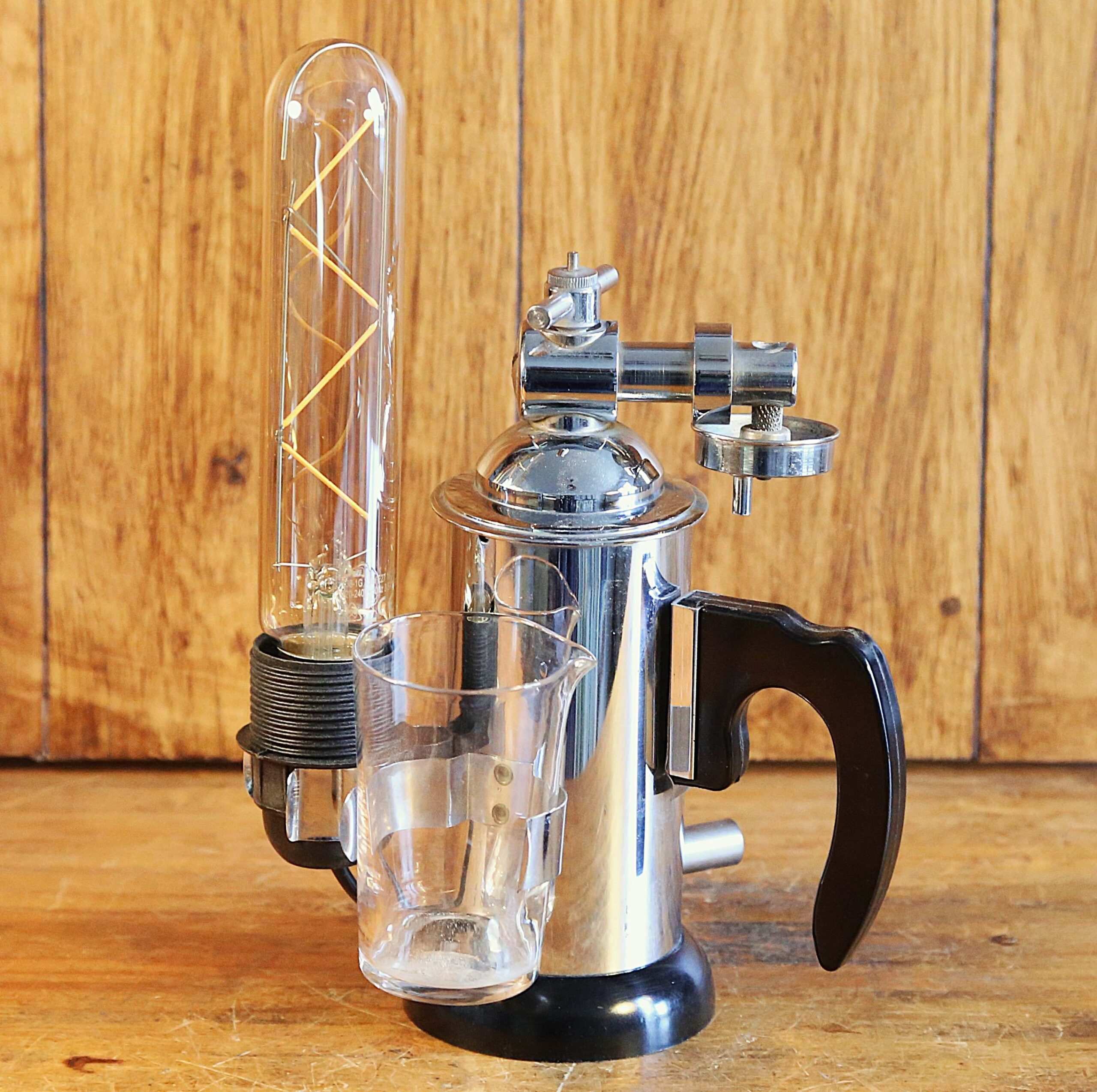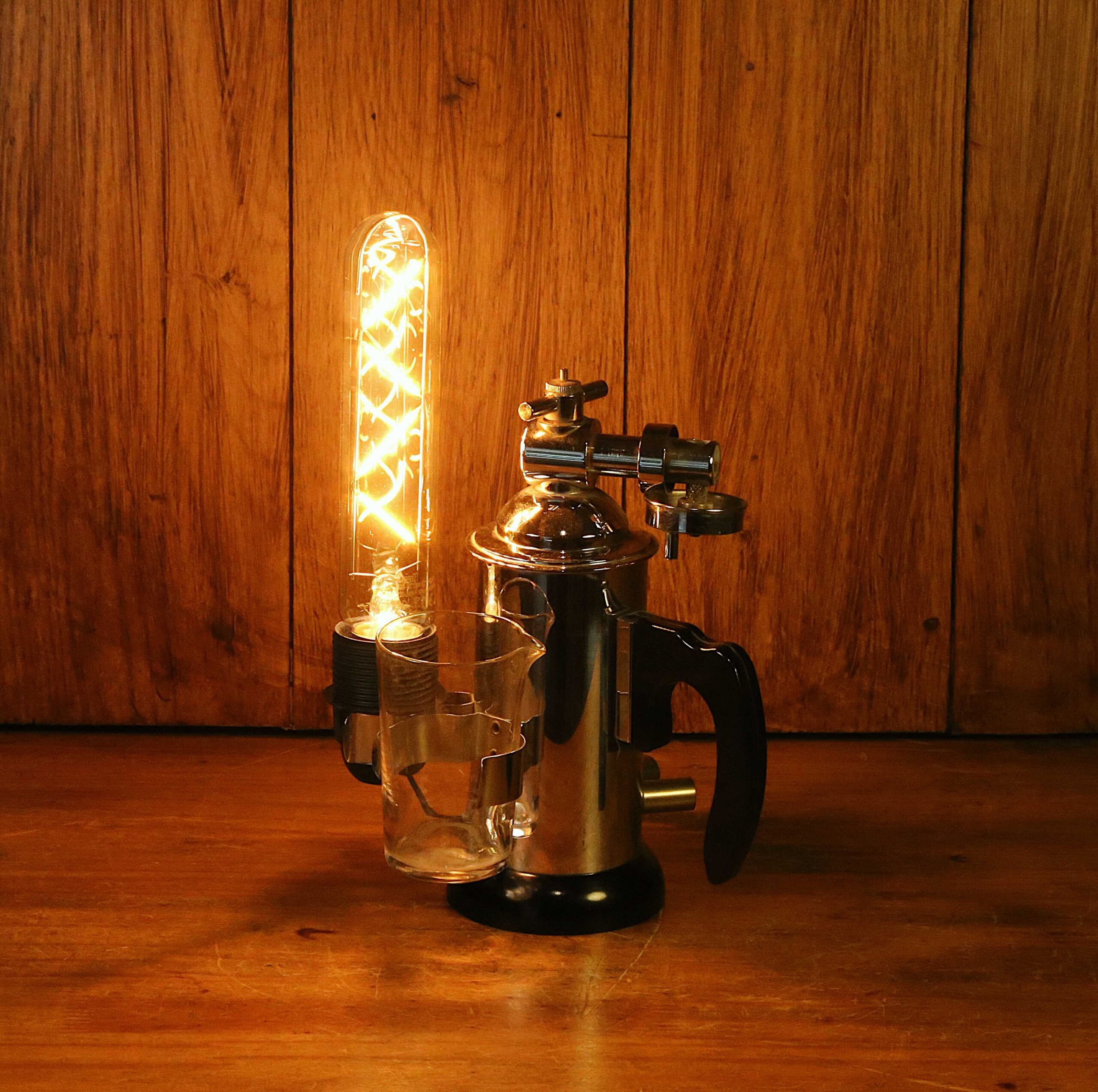 Création originale d’une étrange lampe de métier vintage à partir d’un ancien instrument de beauté et de médecine. Datant des années 60, cet étrange instrument est un pulvérisateur Lucas Championnière datant des années 60 et fabriqué par la société Holo-Electron à Paris. Je lui ai rajouté une belle ampoule LED de type Edison qui procure une éclairage original et chaleureux, et apporte une touche Steampunk à cet instrument déjà très particulier. Une petite lampe tout mignonne, peu encombrante, facile à placer qui procure un éclairage d’ambiance très chaleureux et très original.