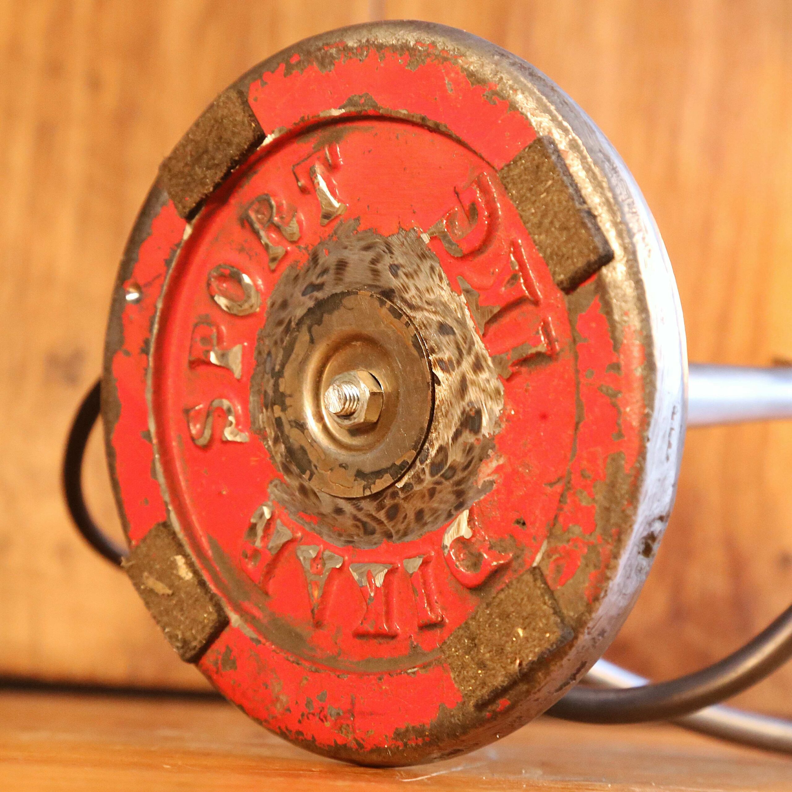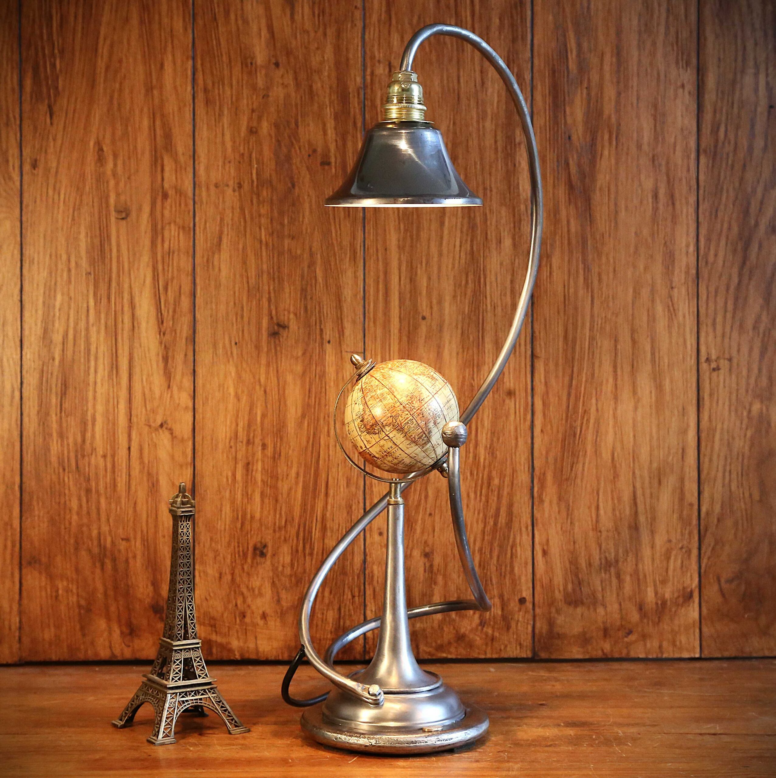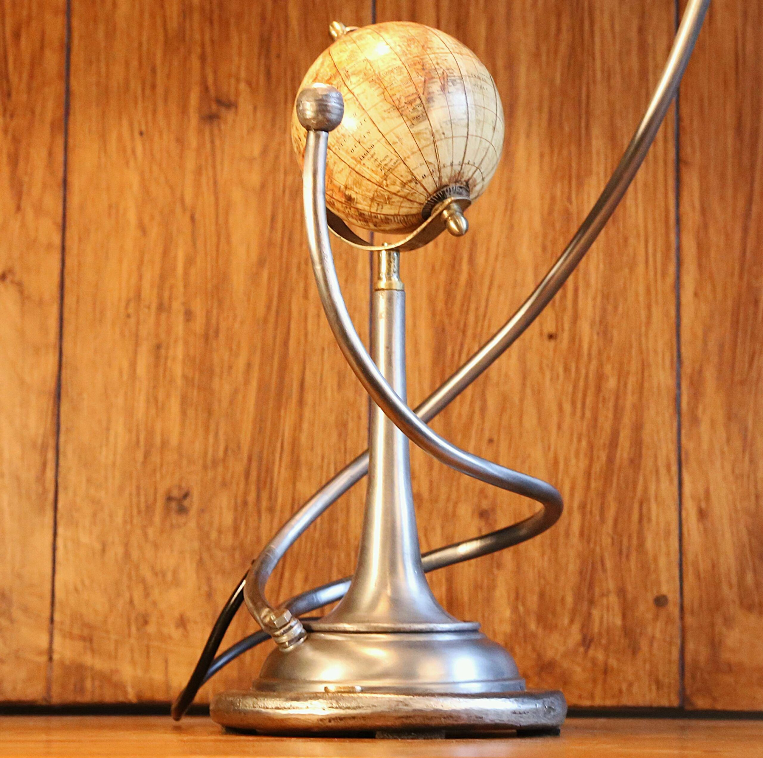 Inspiration Art Nouveau et Art déco pour cette lampe unique créée à partir d’un petit globe terrestre vintage. Le support de la mappemonde est constitué de diverses pièce sen acier de récupération. La base est un poids d’altère vintage en acier massif, dont le poids de 1 kilo assure une très bonne stabilité à la lampe. Placée à l’extrémité d’un bras courbé en acier, un petit satellite en métal veille sur notre belle planète. Les courbes du grand bras, cintré à la main dans mon atelier, sont inspirées des formes végétales et tout en courbes du style Art Nouveau. L’abat-jour est une petite cloche de plafonnier en acier. Une très belle lampe d’explorateur et de voyageur, toute en courbes et bien « spiralée », qui nous transporte à la fin du 19 ème siècle.