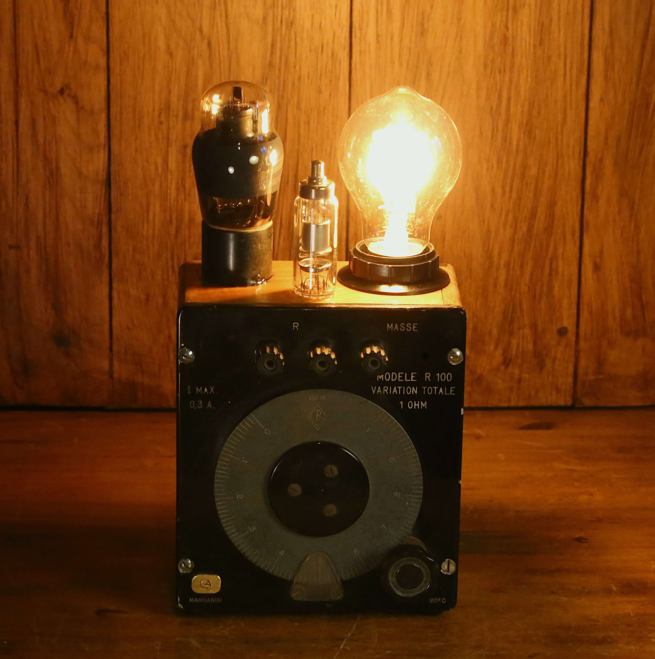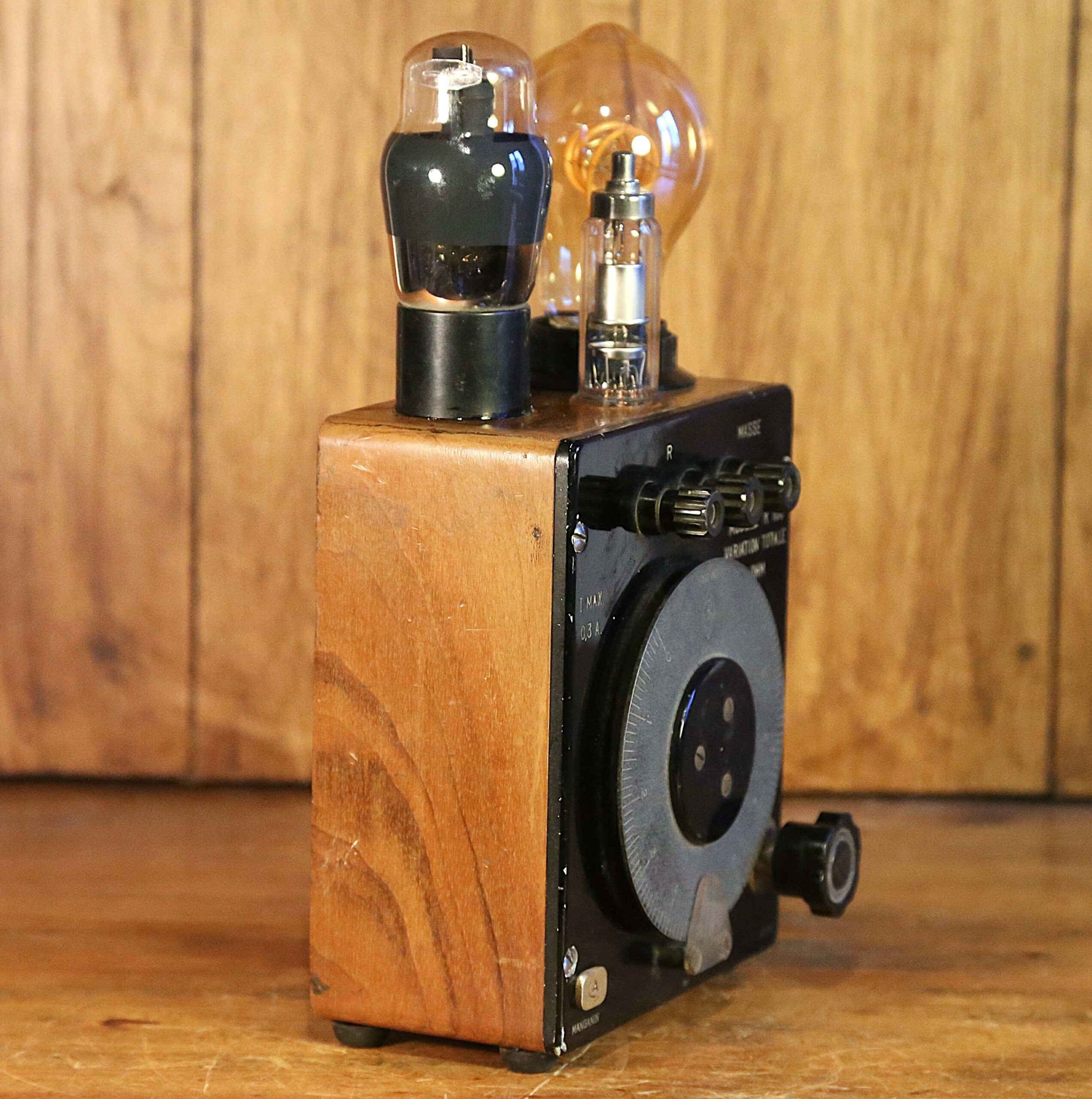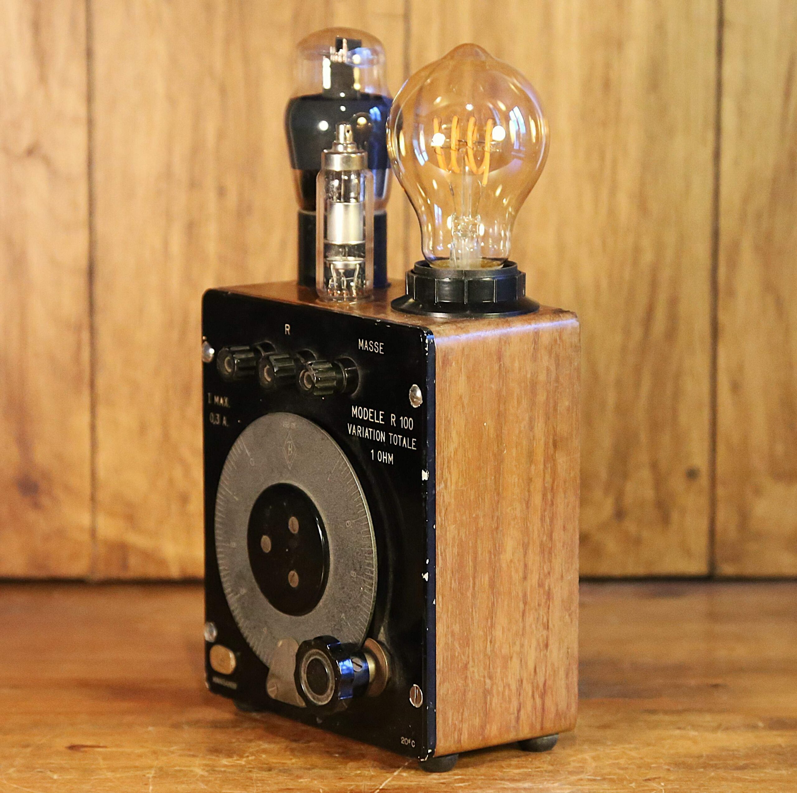 Création unique d’une lampe originale esprit Steampunk et rétrofuturiste à partir d’un instrument de mesure électrique vintage des années 30. En bakélite et en bois massif vernis, cet objet de collection est un ancien instrument qui permettait de mesurer la conductibilité d’un câble pu d’un fil, c’est à dire sa résistance, exprimée en Ohms. L’instrument est surmonté par deux lampes tube, un composant électrique, ancêtre du transistor, que l’on trouvait à l’intérieur des postes de radio ou de télévision, et dans les amplis. L’éclairage est assuré par une ampoule LED type Edison qui diffuse une lumière chaleureuse et un peu orangée.
