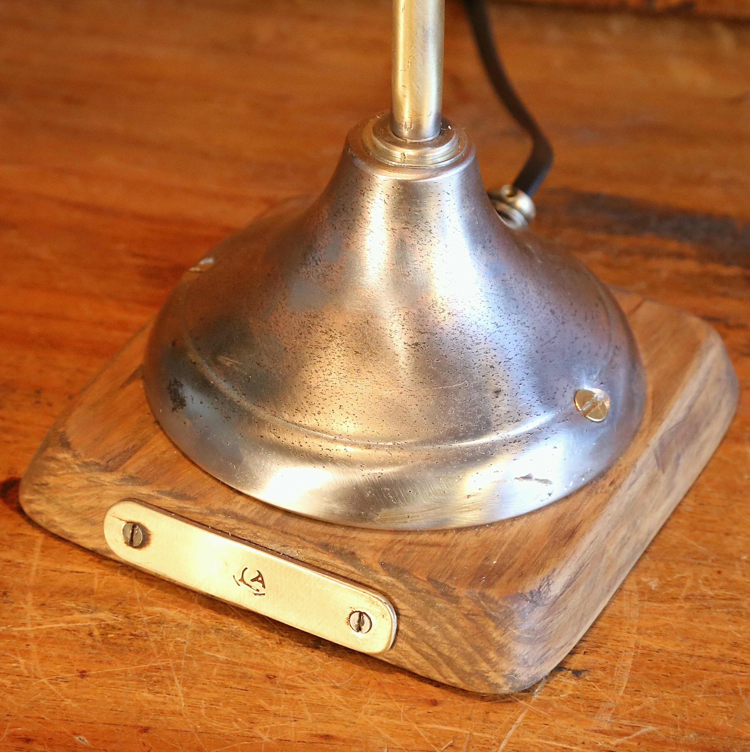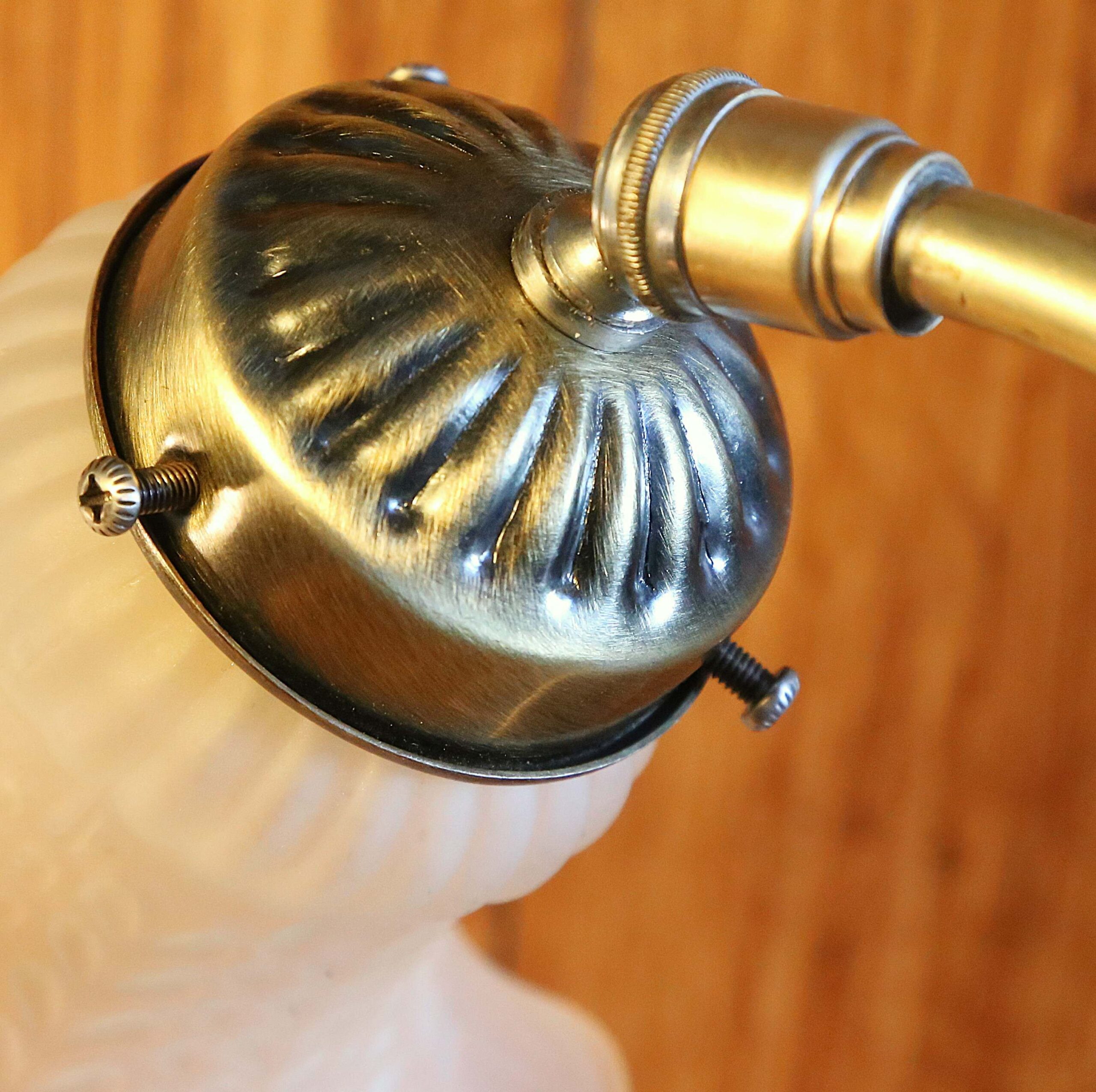 Lampe unique à poser de style Art Déco et Art Nouveau en laiton et abat-jour fleur en pâte verre. Elle a été réalisée à partir d’anciens éléments de lampes de style Art Nouveau. La base, en acier, est fixée sur un socle en bois massif patiné par le temps. Suffisamment lourd, il assure une bonne stabilité à la lampe. L’abat-jour tulipe en pâte de verre a une forme de fleur en clochette. Un système à rotule permet de l’orienter à sa guise pour diriger la lumière. Le fil électrique circule à l’intérieur du bras courbé, en laiton doré. Une mignonne petite lampe qui fête le printemps et trouvera facilement sa place sur un bureau, un chevet ou un bout de canapé par exemple.