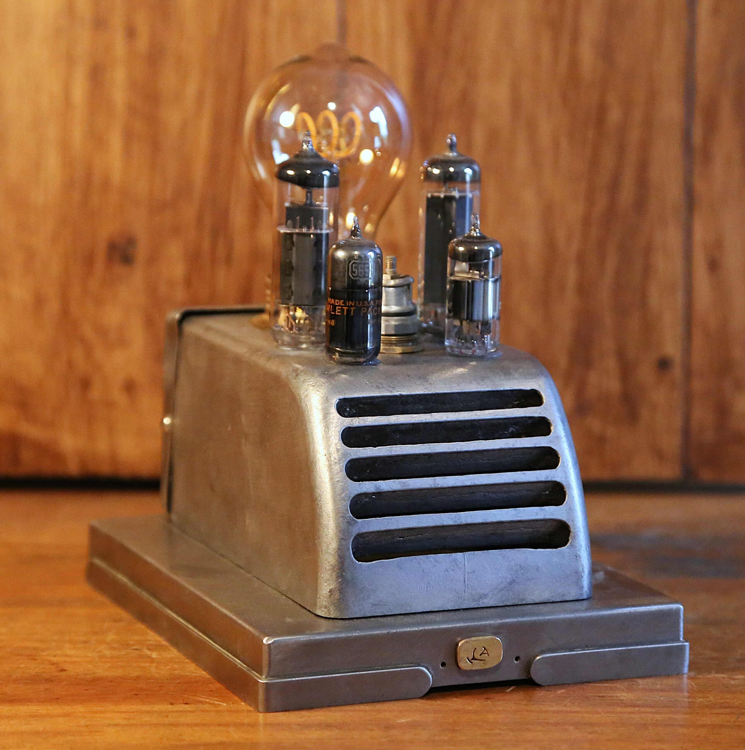 Création unique d’une lampe de table ou de bureau style Steampunk en métal fabriquée à la main dans mon atelier. Elle a été réalisé à partir d’une petite boité en métal qui est un ancien support de projecteur de films des années 50. La peinture a été soigneusement retiré pour faire apparaitre la jolie patine du métal. Il est fixé sur un support lui aussi métal, qui est le couvercle de protection d’un ancien instrument de mesure. Sur le dessus, j’ai greffé un petit connecteur en métal et des lampes lampes tubes, composants électriques que l’on trouvait autrefois dans les postes de radios TSF, les télés, les amplis, les appareils de mesure, … Une ampoule LED de type Edison procure un éclairage original et chaleureux. Ambiance garantie !