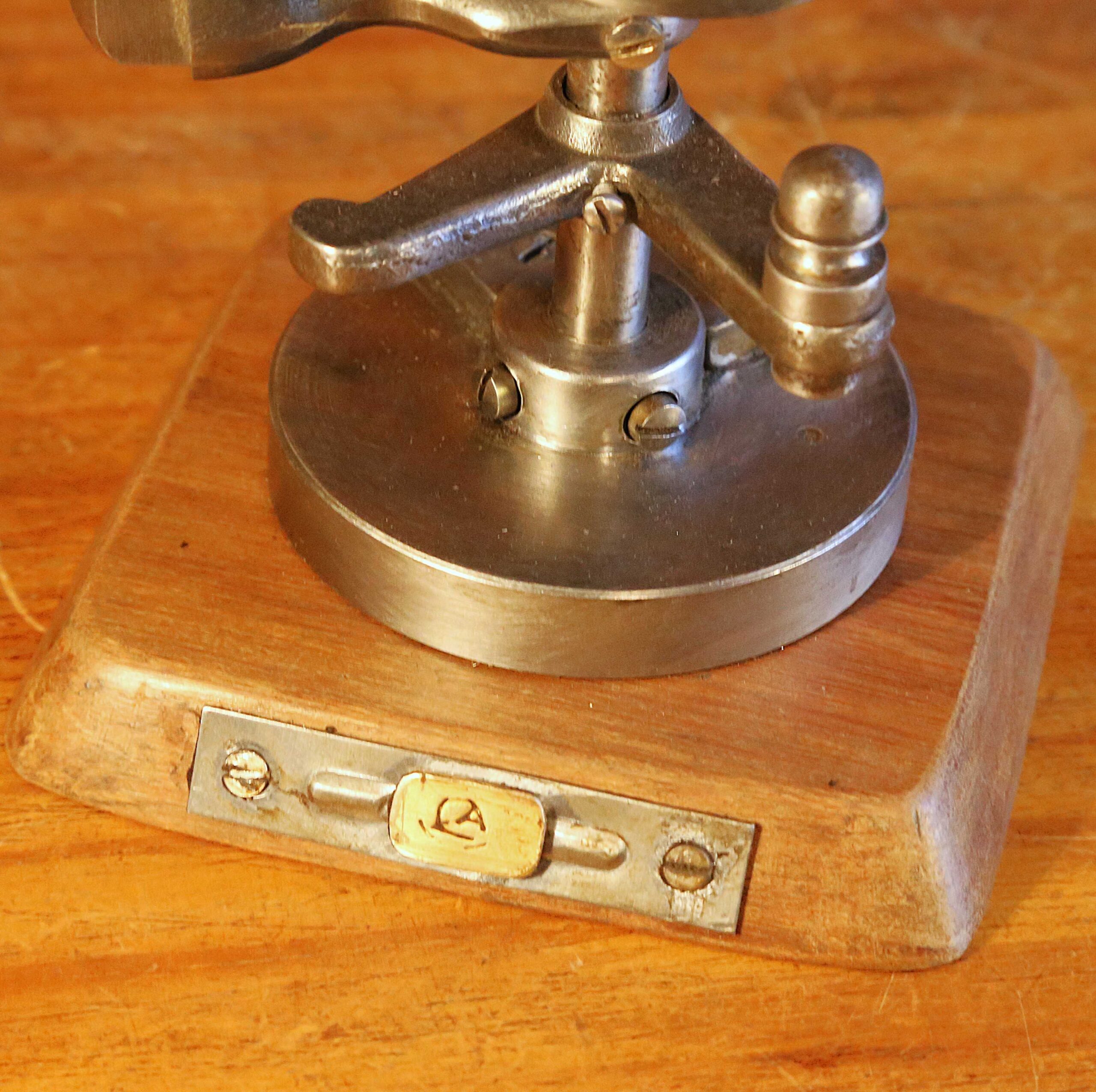 Cette sculpture artisanale unique est un mobile décoratif réalisé en assemblant de nombreux petits mécanismes métalliques récupérés sur d’anciennes machines à coudre Singer. A la base, un socle en veux chêne massif patiné par le temps met en valeur la couleur du vieux métal des mécanismes et assure une bonne stabilité au mobile. La partie en mouvement est constituée d’un bras en acier, légèrement cintré, sur lequel est fixé à l’une des extrémités un petit globe terrestre, dont les parties en métal sont en laiton, et à l’autre extrémité une pièce en acier qui fait office de contre-poids. Après, il faut beaucoup de patience et de minutie pour trouver le point d’équilibre qui permette à la terre de tourner autours de l’axe du bras, dans un hypnotique mouvement circulaire. Un petit bouton en acier facilite la mise en place du mobile sur son support. Ainsi, après l’avoir lancé doucement avec la main, la terre tourne et ondule longtemps, sans aucun bruit. Un objet décoratif original et animé, qui invite aux voyages et dont le mouvement circulaire est presque hypnotique.